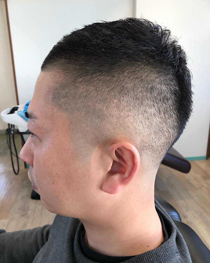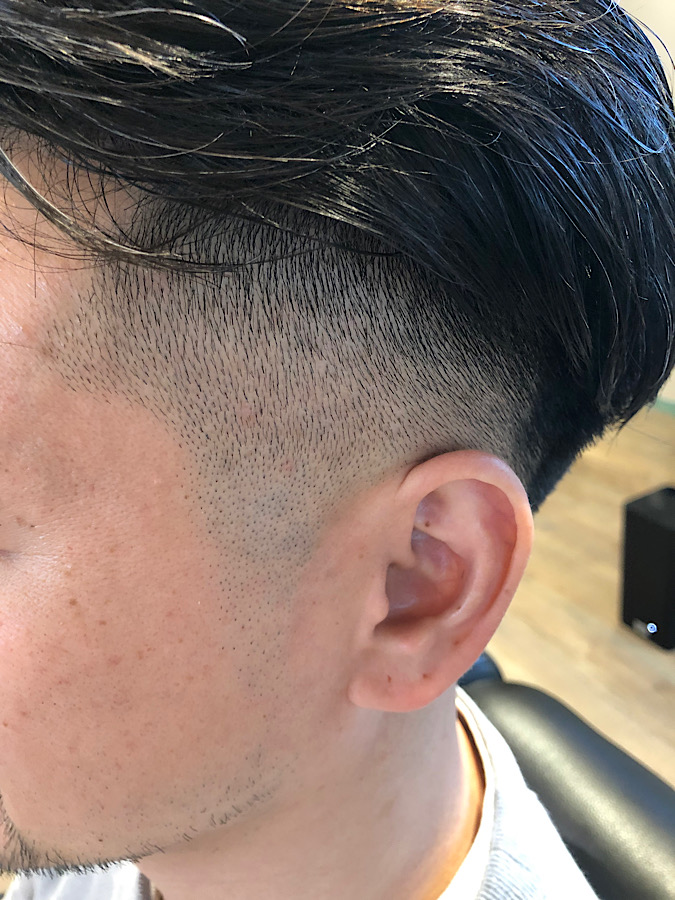 静岡市葵区の理容店"Barber&spa Cresta"です。今回は"フェードスタイル"の紹介です今までは0.3mmでしたが0mmチャレンジ!フェード幅がかなり広いので従来のフェードスタイルとは少し違いますが、やった本人がフェードと言ったらフェードです😁裾周りはスキンフェード、その上が0.3mmトップは少し長めでアイロンパーマでクセ毛風に😊2枚目の画像はツーブロックのフェードスタイルのアップです😊